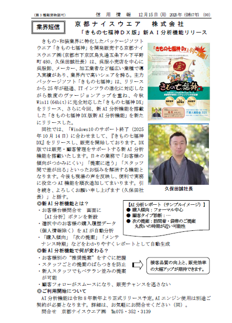 2025年12月16日 / 最終更新日時 : 2025年12月16日 久保田誠 お知らせ 信用情報 業界短信2025/12/15 投稿者プロフィール 久保田誠 最新の投稿 お知らせ2025.12.16信用情報 業界短信2025/12/15 お知らせ2025.12.05きもの七福神Dx版 AI分析機能リリース お知らせ2025.08.29信用情報 業界短信(2025/8/29) お知らせ2025.03.192025春ご案内